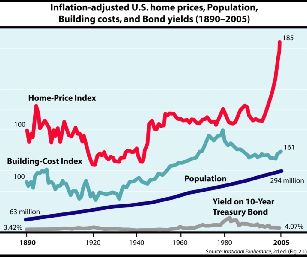 ساهمت أسعار الأراضي في زيادة الأسعار أكثر مما ساهمت به الأبنية، ويمكن استنتاج قيمة تقديرية لأرض أحد المنازل عن طريق طرح القيمة البديلة للبناء والمعدلة حسب الاستهلاك من سعر المنزل. حسب ديفيس وبالومبو قيمة الأراضي لنحو 46 منطقة كبرى في الولايات المتحدة باستخدام المنهجية السابقة، والتي يمكن العثور عليها ضمن الموقع الإلكتروني لمعهد لينكولن لسياسة الأراضي.