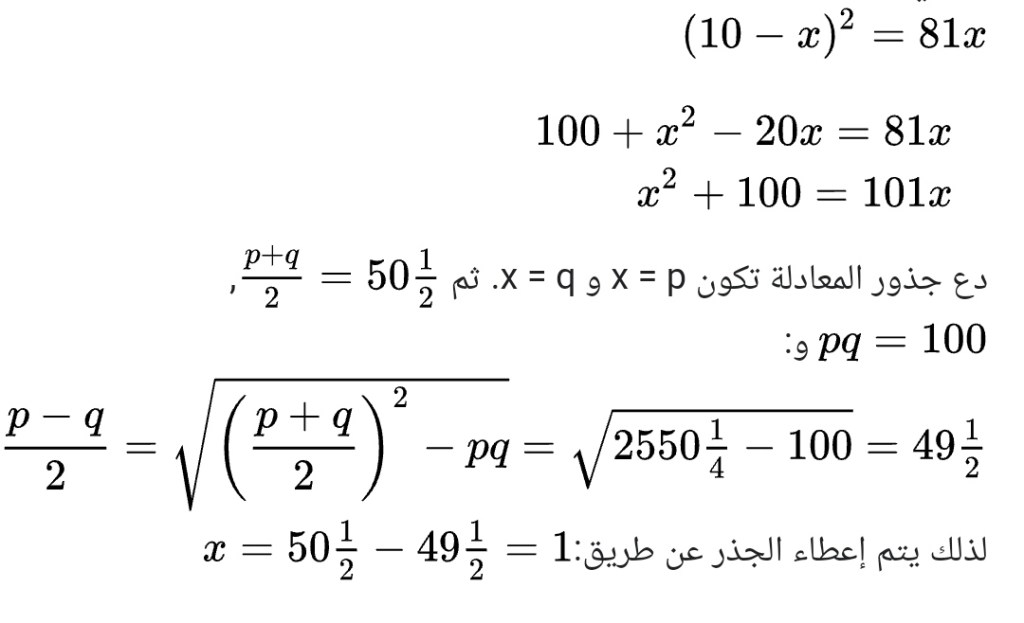 إذا قال أحدهم: “يمكنك تقسيم عشرة إلى قسمين: اضرب الجزء بمفرده، فسيكون مساويًا للآخر الذي تم التقاطه واحد وثمانين مرة.” الحوسبة: أنت تقول، عشرة أشياء أقل، مضروبة في حد ذاتها، هي مائة زائد مربع أقل من عشرين شيئًا، وهذا يساوي واحد وثمانين شيئًا. افصل بين عشرين شيئًا ومائة مربع، وأضفها إلى واحد وثمانين. سيكون بعد ذلك مائة زائد مربع، أي ما يعادل مائة وواحد جذور. نصف الجذر؛ الشق هو خمسون ونصف. اضرب هذا في حد ذاته، فهو ألفان وخمسمائة وخمسون وربع. مع طرح مائة من هذا. الباقي الفان واربع مئة وخمسون وربع. استخراج الجذر من هذا؛ إنه تسعة وأربعون ونصف. طرح هذا من جزء الجذور، وهو خمسون ونصف. لا يزال هناك واحد، وهذا واحد من الجزأين.
