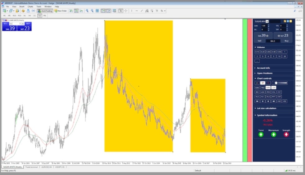تسلط المربعات الصفراء في الرسم البياني أعلاه الضوء على الانخفاضات الحادة في سعر السكر ابتداءً من عام 2010. و مع ذلك، كان هناك ارتفاع في الفترة ما بين سبتمبر 2015 إلى سبتمبر 2016، بسبب المخاوف من النقص العالمي. في الواقع، كان السبب في انقطاع الإمداد لمحصول قصب برازيلي (وهو أكبر منتج في العالم)، هو الذي ساعد السكر ليصبح “نادراً” ، وبالتالي تسبب في ارتفاع الأسعار.