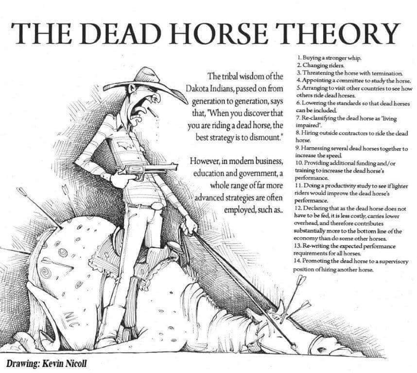 اذا اكتشفت أنك تركب حصاناً ميتاً (أو على وشك الموت) فإن أفضل إستراتيجية هي أن تنزل عنه”.