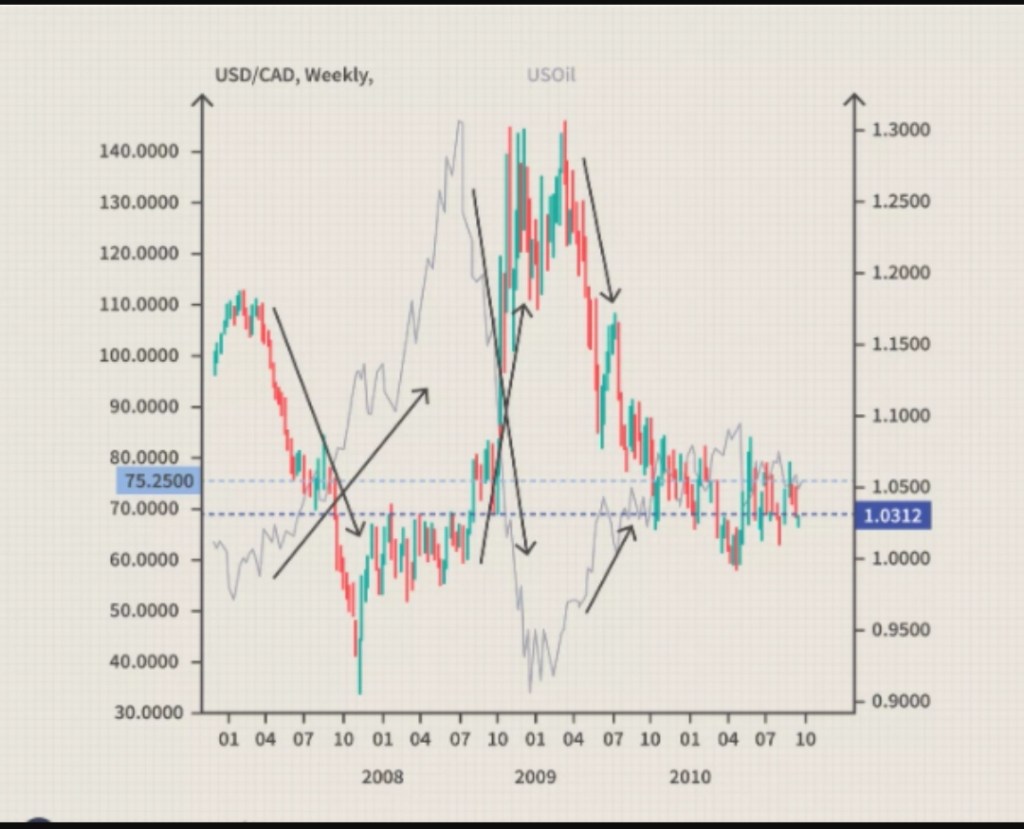 نظرًا للعلاقة الوثيقة بين كندا واليابان وبين أسعار النفط، فإن سعر النفط والكمية المستوردة تؤثر على اقتصاد اليابان. بينما سعر النفط والكمية المصدرة تؤثر على اقتصاد كندا؛ إذًا زوج الدولار الأمريكي/ الدولار الكندي يرتبطان إيجابيًا بأسعار النفط.