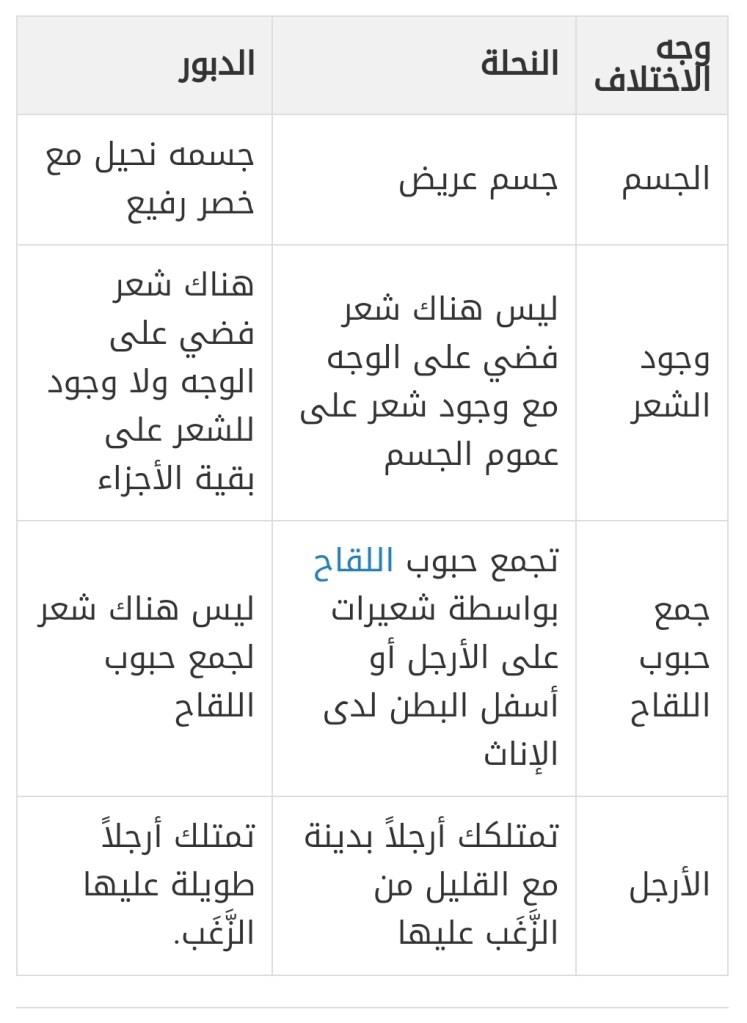 الفرق بين النحل والدبور يتميَز الدبور في مملكة النحل عن النحلة فيها بعدة أمور وهي: