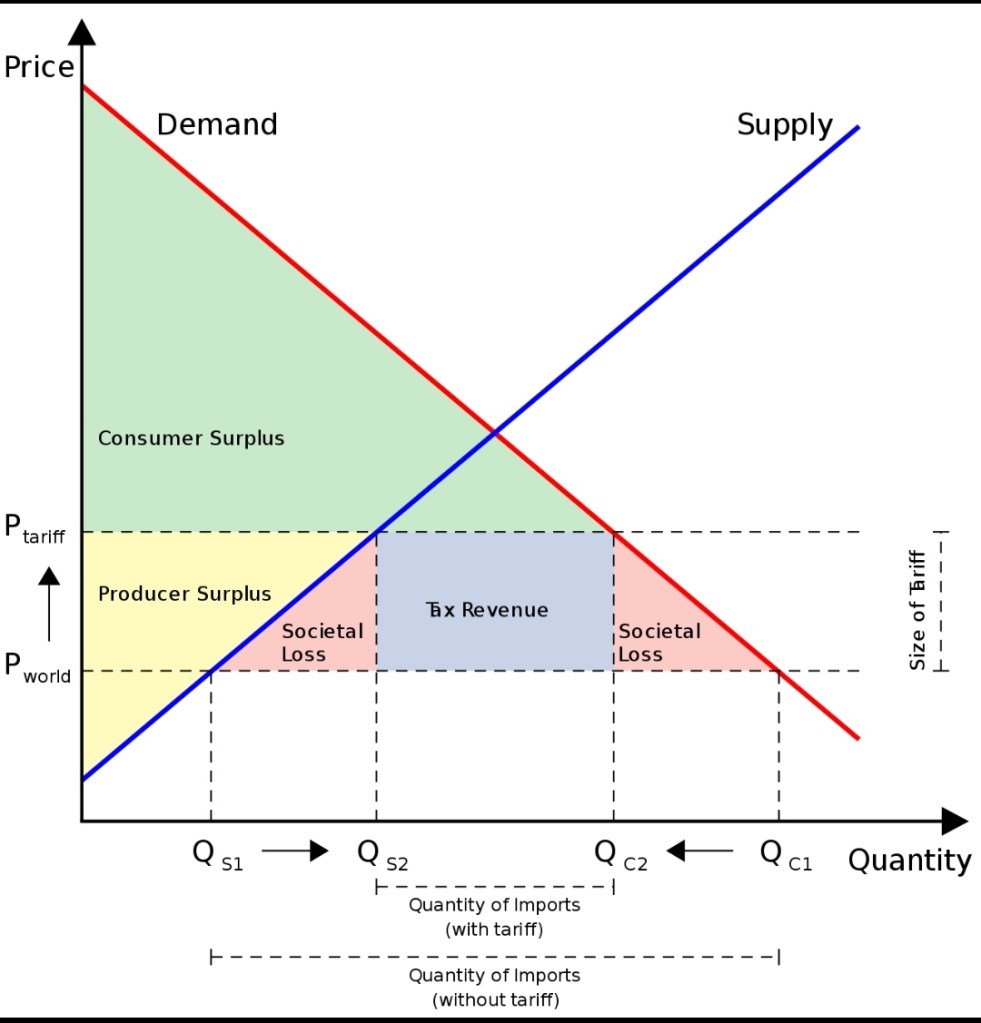 ينتج عن هذا ثلاثة آثار رئيسة على الرفاه المجتمعي. يصبح المستهلكون أسوأ حالًا لأن فائض المستهلك (المنطقة الخضراء) أصبحت أصغر. يصبح المنتجون أفضل حالًا لأن فائض المنتج (المنطقة الصفراء) أصبحت أكبر. للحكومة أيضًا واردات ضريبية إضافية (المنطقة الزرقاء). مع هذا، فإن خسارة المستهلكين أكبر من ربح المنتجين والحكومة. يظهر حجم الخسارة المجتمعية في المثلّثين الزهريين. إزالة التعاريف الجمركية واعتماد التجارة الحرة مكسب صافٍ للمجتمع.