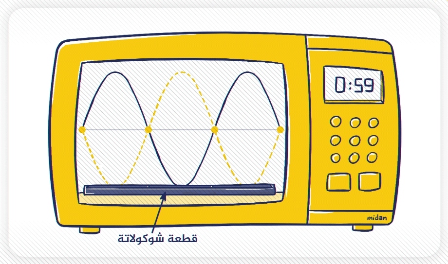 كل ما تحتاجه هو جهاز ميكروويف، أزل منه الطبق الدوار، وضع بطول الميكروويف قطعة شيكولاتة طويلة، ثم أدر الجهاز لمدة دقيقة واحدة، ما سوف يحدث هو أن موجات الميكروويف هي موجات راكدة، تهتز فقط لأعلى ولأسفل في نفس المكان، في منطقة العقد بين الاهتزازات تكون طاقة الموجة أقل ما يكون، بينما تكون أعلى ما يكون في مناطق الموجات؛ لذلك حينما تخرج قطعة الشيكولاتة سوف تجد على سطحها مجموعة من النقاط التي انصهرت، والنقاط الأخرى التي لم تبدأ في الانصهار بعد.