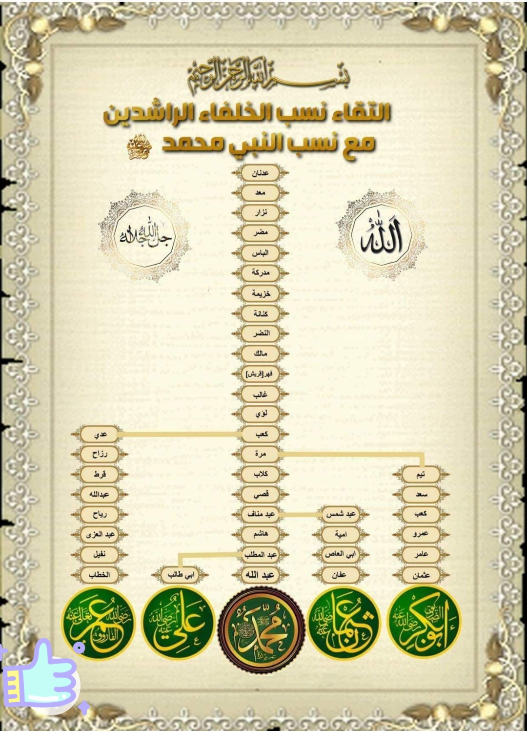 هو محمد بن عبد الله بن عبد المطلب بن هاشم بن عبد مناف بن قصي بن كلاب بن مرة بن كعب بن لؤي بن غالب بن فهر بن مالك بن النضر بن كنانة بن خزيمة بن مدركة بن إلياس بن مضر بن نزار بن معد بن عدنان من ذرية إسماعيل بن إبراهيم.