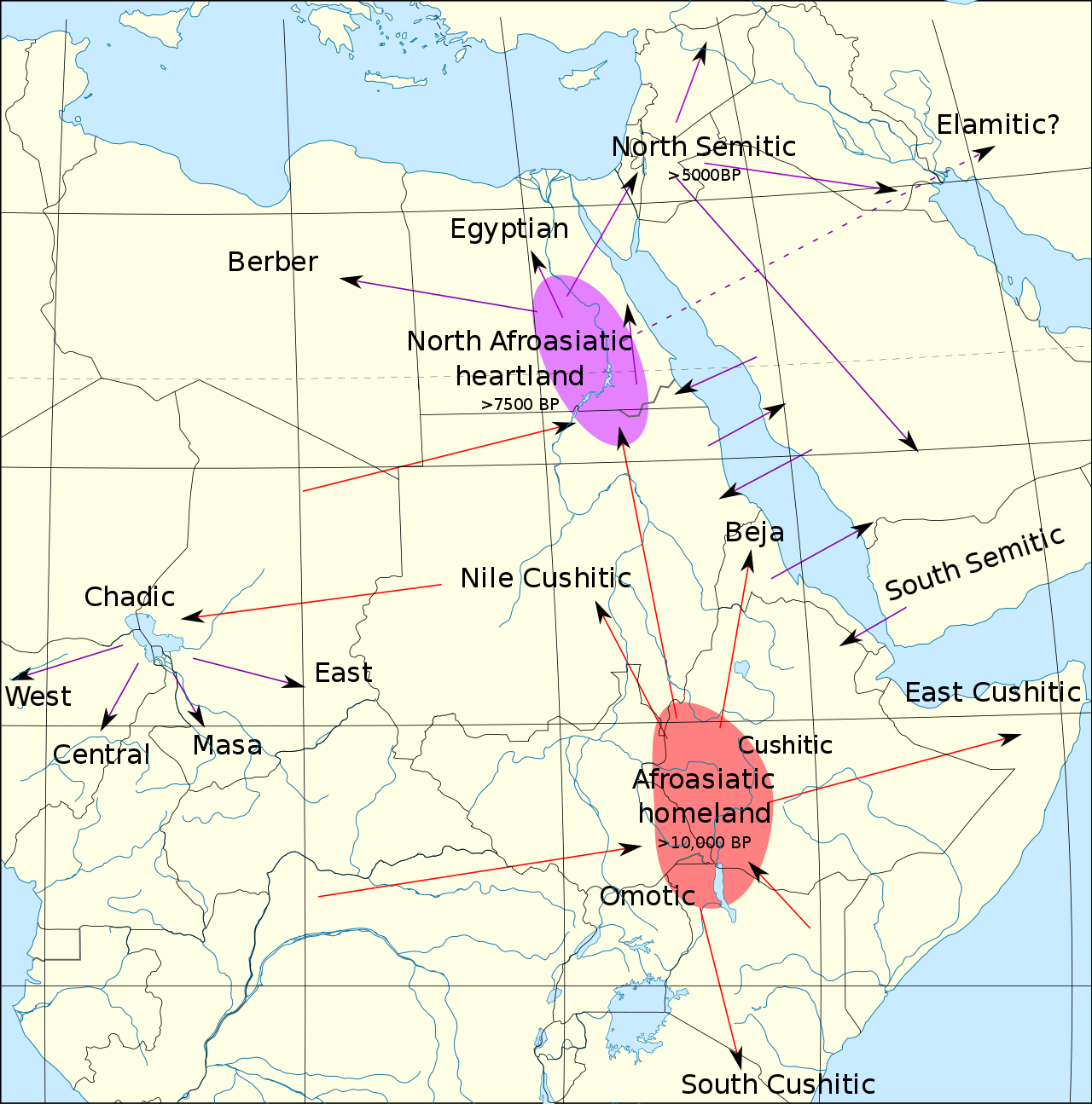 خريطة توضح توسع اللغات الآفروأسيوية من موطنها الأصلي المحتمل أثيوبيا قبل الميلاد ثم تشكيل اللغات السامية.