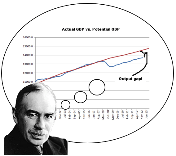 قاد كينز ثورةً في التفكير الاقتصادي في أثناء فترة الكساد الكبير التي تحدى فيها أفكار الاقتصاد الكلاسيكي الجديد المعتمد على التأكيدات بأن السوق الحر سيوفر تلقائياً كل ما يحتاجه الاقتصاد من العمالة بشرط مرونة العُمال في طلب أجورهم. جادل كينز في الفكرة القائلة بأنّ إجمالي الطلب (إجمالي الإنفاق في الاقتصاد) هو المُحدد الأساسي للنشاط الاقتصادي، ورأى أن الطلب الكلي غير المُلائم سيؤدي لفتراتٍ طويلةٍ تتسم بنسبة بطالةٍ مُرتفعةٍ مما سيؤدي لتخفيض أُجور العُمال ممّا يعني أنّ الاقتصاد لن ينتعش بشكلٍ تلقائي مع أسلوب التوظيف للسوق الحُرّة. عليه دعا كينز إلى استخدام السياسات المالية والنقدية للتخفيف من الأثر الكبير للركود الاقتصادي، وفصَّل أفكاره كلها في مؤلفه الأهم الذي نُشر عام 1936 النظرية العامة للتوظيف والفائدة والنقد. بدأت الاقتصادات الغربية في تبني توصيات كينز في أواخر الثلاثينيات من القرن العشرين وبحلول العقدين التاليين كانت الحكومات الرأسمالية كلها تقريباً قد تبنت توصياته. شارك جون مينارد كينز بصفته مندوب بريطانيا في تصميم المؤسسات الاقتصادية الدولية بعد الحرب العالمية الثانية وقدم العديد من التوصيات التي نُقض بعضها لاحقاً من قبل الوفد الأمريكي.