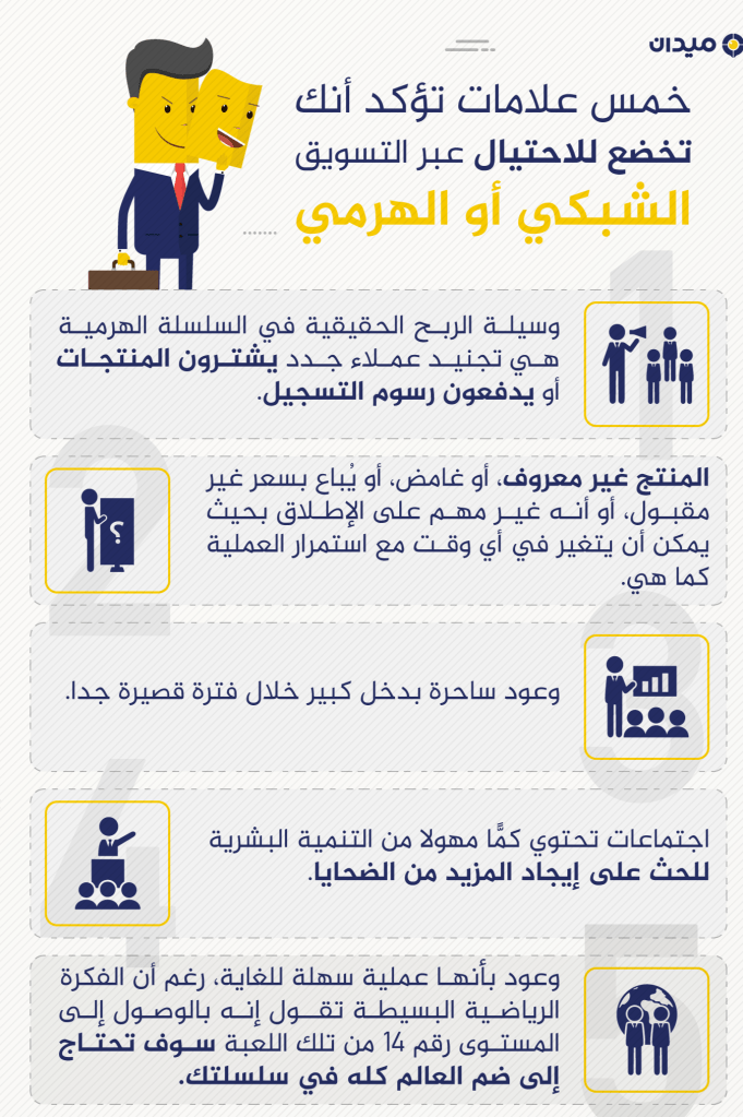 تأمل تلك العلامات الخمس التي أوردناها في الإنفوجراف السابق، حتما ستتذكر ذلك الصديق القديم الذي اتصل بك فجأة في إحدى ليالي الشتاء الفائت ليقول لك: “ما أروع الأيام الخوالي”، وإنك كنت أفضل أصدقائه، وإنها “كانت أيّام”، ثم فجأة يطرح السؤال المُنتظر: “انت تعرف شركة كذا؟”، هنا تبدأ عملية الإقناع، والتي غالبا ما سوف تحتوي على وعود بدخل كبير خلال فترة قصيرة جدا، هذا الدخل لا علاقة له بأن تبذل جهدا في أن “تبيع” شيئا ما للجمهور وتحصل على هامش الربح، ولكن له علاقة فقط بمشتركين جدد سيتسببون لك في هذا الربح.