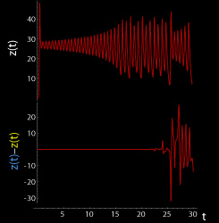 تُظهِر هذه الصورتين جزأين من تطور ثلاثي الأبعاد لمسارين (أحدهما باللون الأزرق والآخر باللون الأصفر) خلال نفس الفترة الزمنية في نظام لورينتز بدءًا من نقطتين مبدئيتين تختلفان بمقدار 10-5 فقط في البعدX، في البداية يبدو المساران متشابهان كما يتضح من الفرق الصغير في الاحداثيات على البعد z للمسارات الزرقاء والصفراء، ولكن عند t> 23 يكون الفرق كبيرًا تبعًا لقيمة المسار، ويشير الموضع الأخير للأكواز إلى أن المسارين أصبحا غير متماثلين عند t = 30. رسم توضيحي لنظام لورينتز يبين الارتقاء المتواصل.
