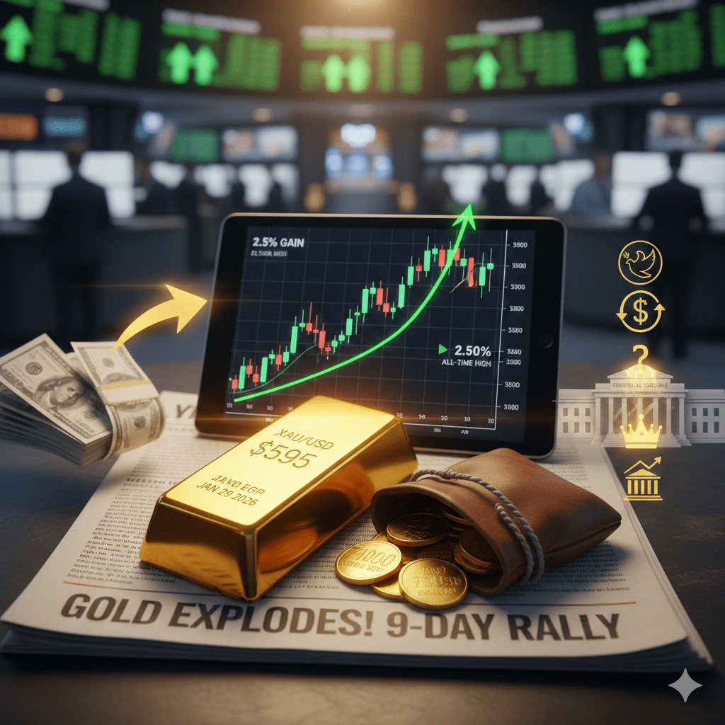 * الأداء: ارتفع الذهب بنحو 2.5% في يوم واحد، مواصلاً سلسلة صعود استمرت لـ 9 أيام متتالية.