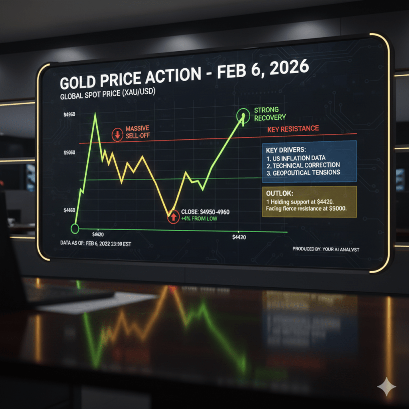 ومع ذلك، لم يستمر الهبوط طويلاً، حيث عاد المشترون للظهور عند المستويات المنخفضة (شراء الملاذ الآمن)، مما دفع السعر للارتفاع مجدداً بنهاية اليوم ليغلق بالقرب من مستويات 4,950 – 4,960 دولاراً للأوقية، محققاً ارتدادة قوية فاقت الـ 4% من أدنى نقطة سجلها خلال اليوم.