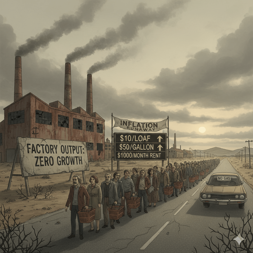 وقد أدى في كلا الحدثين مع النقص العام في الطاقة الذي ميز فترة السبعينيات إلى ندرة فعلية أو نسبية للمواد الخام. أدت ضوابط الأسعار إلى نقص كمية الشراء ما تسبب في تراكم طوابير المستهلكين في محطات الوقود وزيادة تكاليف الإنتاج الصناعي