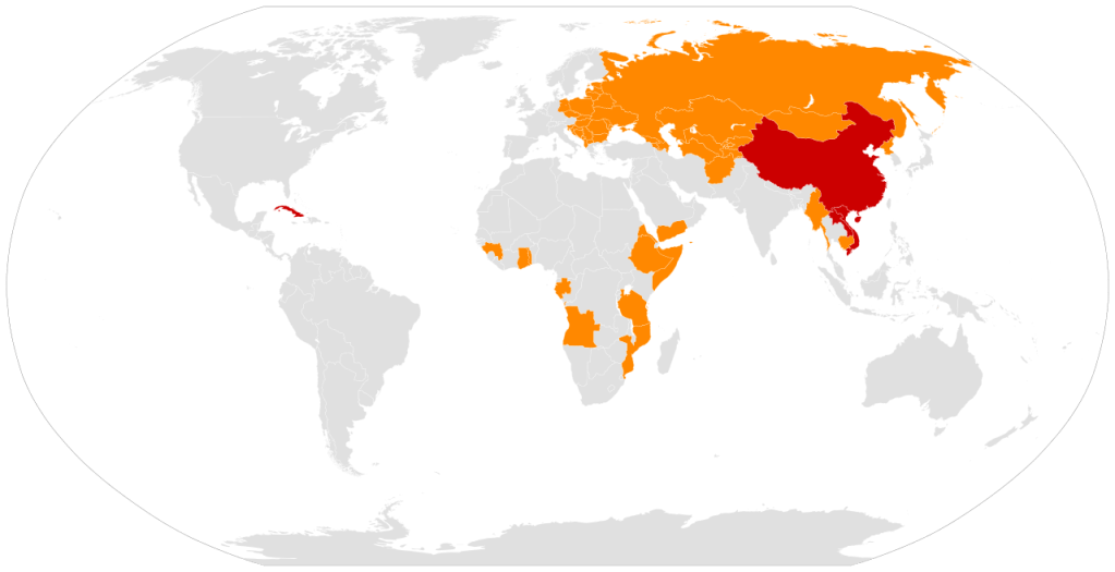والشيوعيون من الأفراد والأحزاب هم المتبنين لهذه النظريات والحركات الاجتماعية والسياسية والاقتصادية الساعية للوصول لذلك النظام الاجتماعي. في سياق الحرب الباردة يشير مصطلح “الكتلة الشيوعية” إلى كتلة جيو – سياسية هيمن عليها الاتحاد السوفييتي وغلب عليها حكم الحزب الواحد أو الدكتاتورية أو الشمولية في تلك الدول. أثّرت الحركة الساعية للوصول للشيوعية بتفسيراتها الماركسية اللينينية بشكل ملحوظ على تاريخ وأحداث القرن العشرين الذي شهد تنافسًا حادًا بين الدول التي ادّعت اتباعها لهذه النظرية وأعدائها.