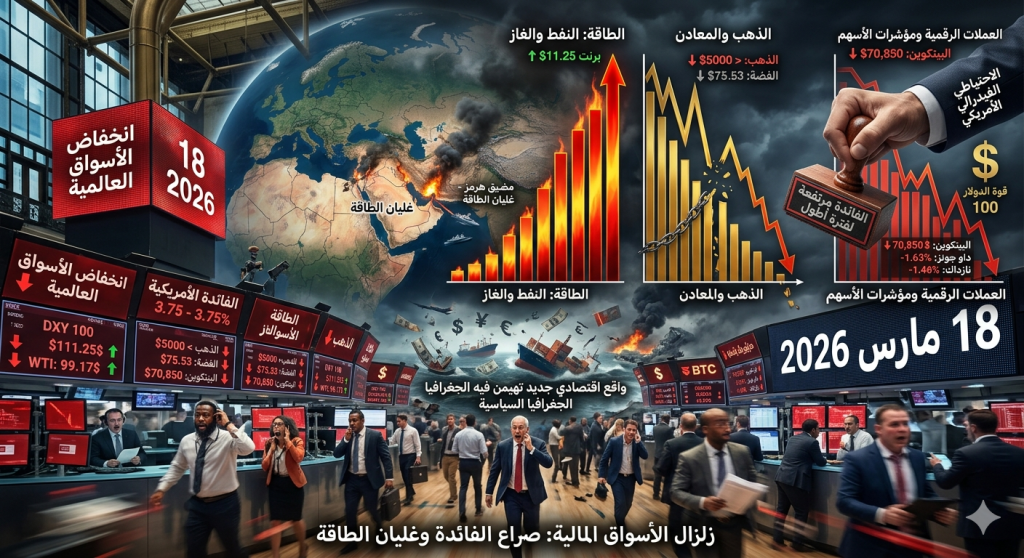 شهدت الأسواق المالية العالمية في تعاملات الأمس، الأربعاء 18 مارس 2026، حالة من إعادة ترتيب الأوراق العنيفة، حيث تقاطعت القرارات النقدية الصارمة مع التوترات الجيوسياسية المتفجرة، لتخلق مشهداً استثمارياً معقداً غلبت عليه الصبغة الحمراء في معظم القطاعات، باستثناء “مملكة الطاقة”.
