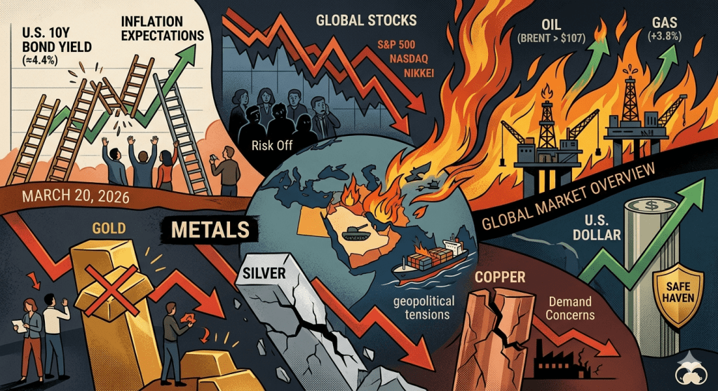 تحليل مفصل لحركة الأسواق العالمية في ختام تداولات الأمس، الجمعة 20 مارس 2026، والتي شهدت تقلبات حادة مدفوعة بتصاعد التوترات الجيوسياسية في منطقة الخليج وتأثيرها المباشر على توقعات التضخم والسياسة النقدية.