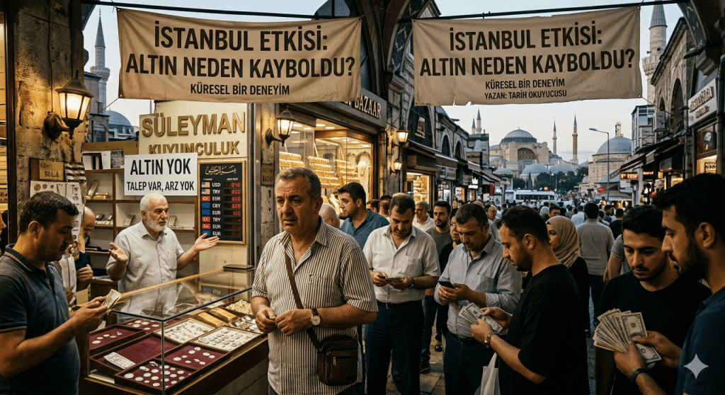 تُظهر الصورة سوق “البازار الكبير” في إسطنبول، حيث تعلو لافتة باللغة التركية تحمل عنوان المقالة: “تأثير إسطنبول: لماذا اختفى الذهب؟ تجربة عالمية.