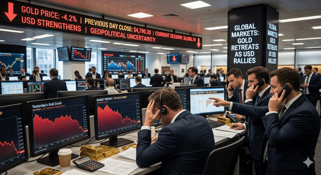 بدأت تداولات الأمس على نبرة إيجابية، حيث لامس الذهب مستويات مرتفعة بالقرب من 4,790 دولاراً للأونصة خلال الجلسات المبكرة، مدفوعاً بآمال التوصل إلى تهدئة في النزاعات الإقليمية في الشرق الأوسط. إلا أن المسار انعكس بشكل حاد مع تقدم ساعات النهار، حيث فقدت الأونصة أكثر من 4% من قيمتها لتستقر عند مستويات تقارب 4,580 إلى 4,677 دولاراً للأونصة بحلول الإغلاق (حسب العقود الآجلة والفورية).