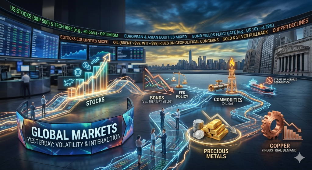 شهدت الأسواق العالمية أمس الخميس، 9 أبريل 2026، حالة من التذبذب الحاد والنشاط المكثف، حيث تقاذفت الأسعار أنباء متضاربة حول استقرار وقف إطلاق النار بين الولايات المتحدة وإيران والمخاوف المتعلقة بإعادة فتح مضيق هرمز.