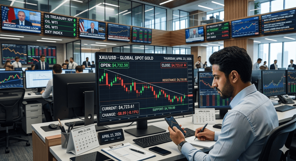 إليك ملخص لحركة سعر أونصة الذهب في الأسواق العالمية ليوم أمس الخميس، 23 أبريل 2026، بناءً على آخر التحديثات والبيانات الاقتصادية: