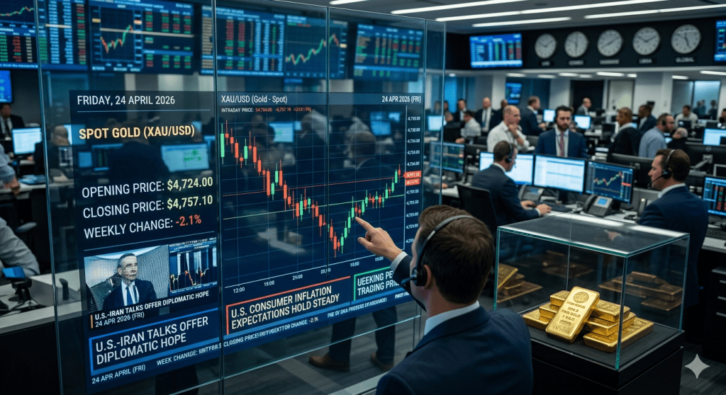 شهدت أسواق المعادن الثمينة يوم الجمعة الماضي، الموافق 24 نيسان 2026، حالة من التذبذب المائل نحو الاستقرار الإيجابي الطفيف، حيث حاول الذهب استعادة توازنه بعد ضغوط بيعية شهدها خلال الأسبوع. تأثرت التحركات بمزيج من العوامل الجيوسياسية المتمثلة في أنباء المفاوضات الأمريكية الإيرانية، والبيانات الاقتصادية القادمة من الولايات المتحدة.